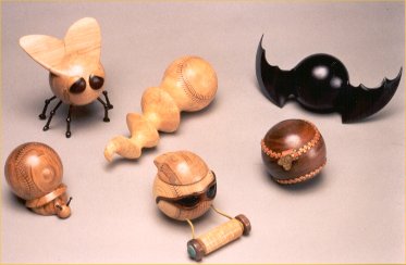 An ongoing series of sculptures on a baseball theme, (L to R) "Slow Ball," "High Fly," "Screwball," "Grass Cutter," "Baseball Bat," "Fly Ball (note fly!)" Also see "Baron Von Baseball."