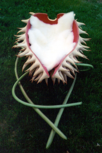 This is a functional baby crib made from mahogany and steam-bent curly maple that has been dyed.