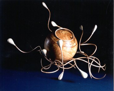 Walnut bowl (ovum) and steam bent ??? (sperm). The lid comes off the bowl (see closeup) revealing the winning sperm.